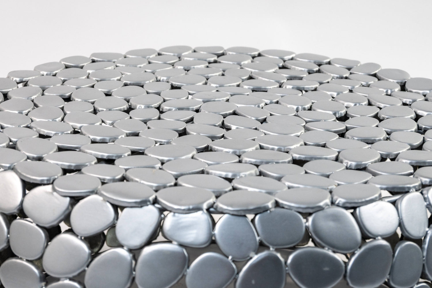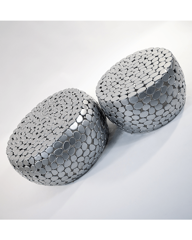 Ez a két darabból álló alumínium kisasztal szett igazán különleges választás minden modern otthonba, lounge térbe vagy exkluzív vendéglátóhelyre. A kör alakú, polírozott mintázat egyedi, kézzel készült felületet biztosít, amely minden darabot megismételhetetlenné tesz.