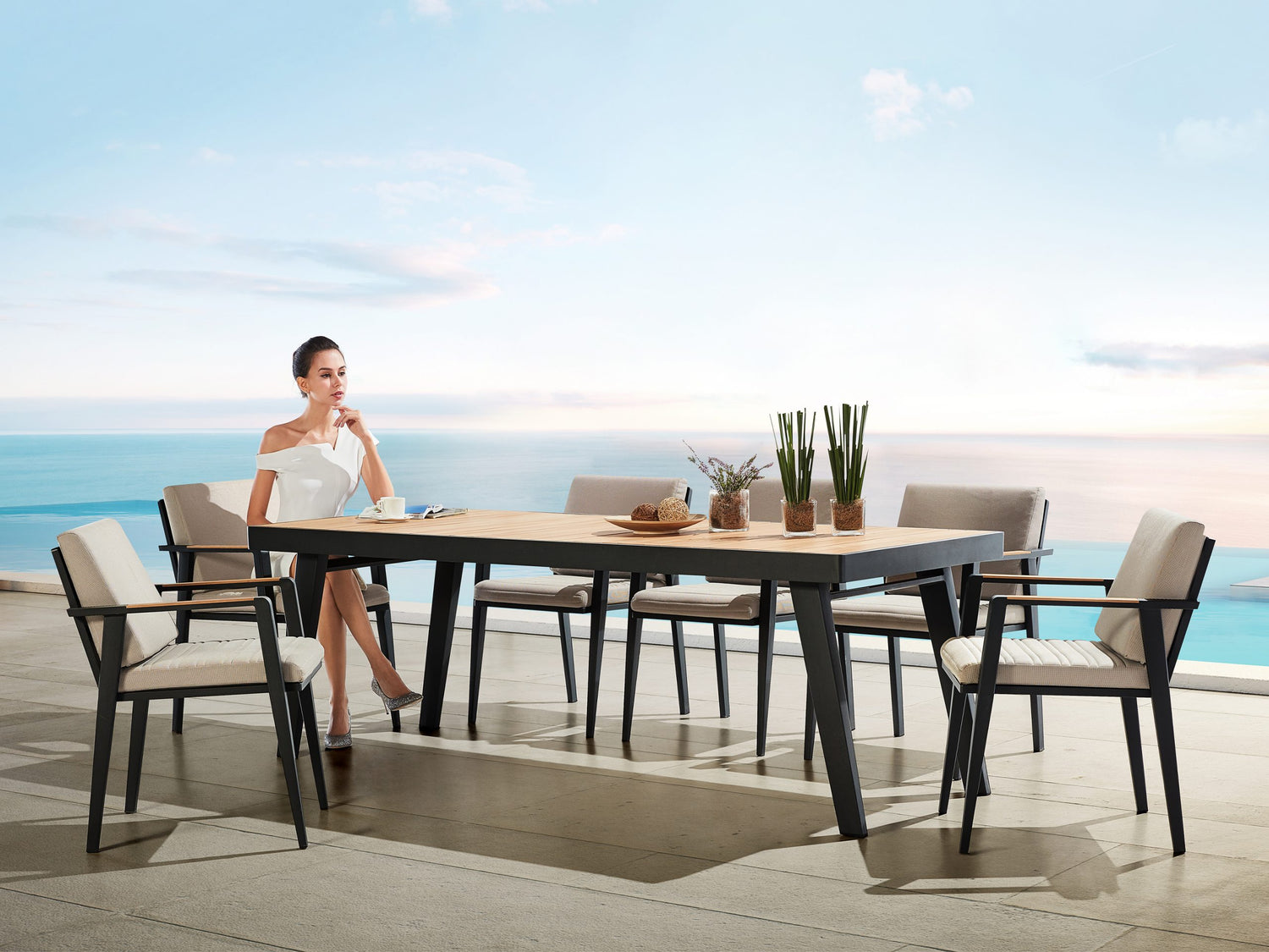 Az Emoti Dining Set tökéletes választás mindazok számára, akik eleganciát, funkcionalitást és kényelmet keresnek kültéri étkezőgarnitúrájukban. A fekete porszórt alumínium váz és a természetes teakfa hatású asztallap letisztult, modern megjelenést kölcsönöz, míg a taupe színű, párnázott székek gondoskodnak a maximális kényelemről.
