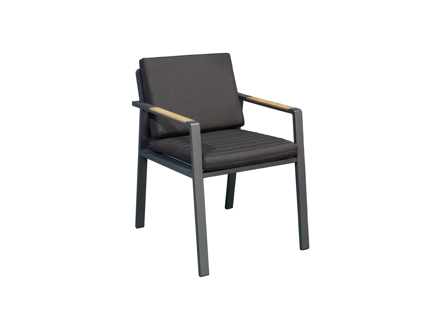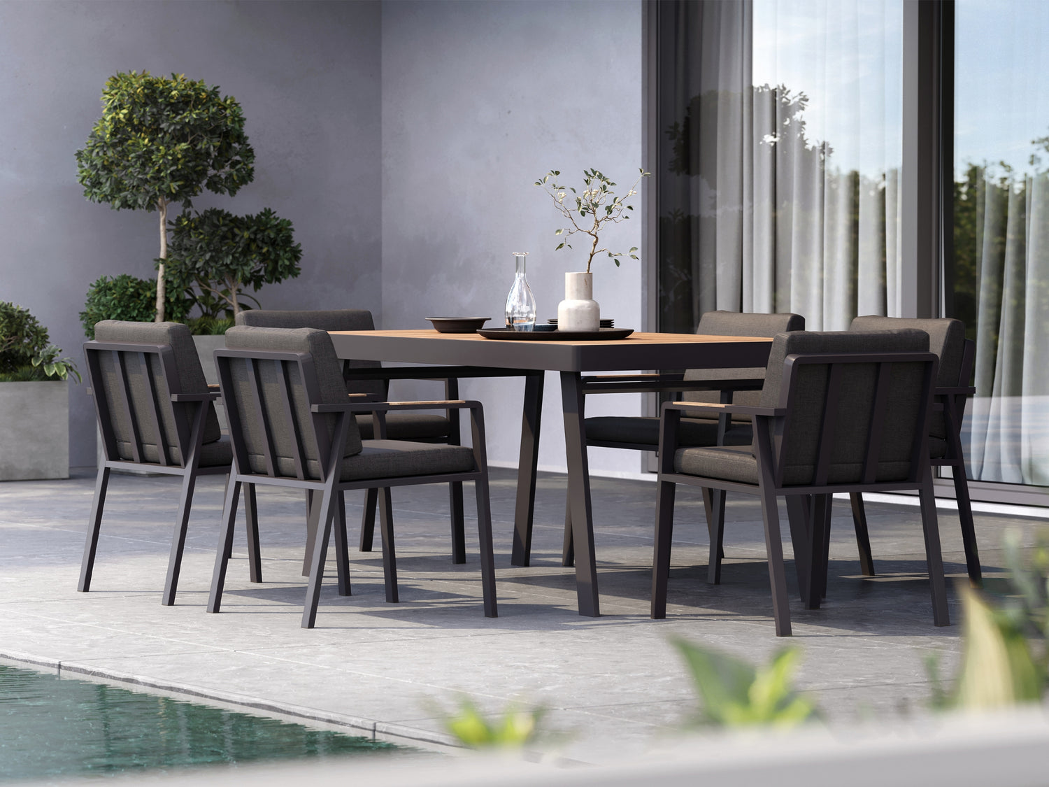 A Nofi Dining Set egy prémium minőségű kültéri étkezőgarnitúra, amelyet a modern stílus, a funkcionalitás és a kényelem tökéletes egyensúlya jellemez. A fekete porfestett alumínium vázzal és elegáns teakfa hatású asztallappal rendelkező szett ideális nagyobb szabadtéri étkezésekhez, családi eseményekhez vagy baráti összejövetelekhez.