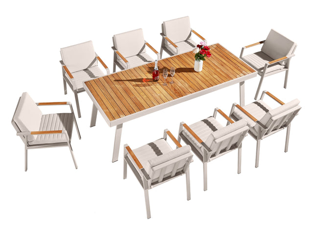 A Nofi Dining Set tökéletes választás, ha egy stílusos, kényelmes és időjárásálló kültéri étkezőszettre van szükséged. A taupe színű alumínium váz és a természetes teakfa hatású asztallap modern megjelenést kölcsönöz a szettnek. A 8 párnázott étkezőszék ideális hosszabb kerti összejövetelekhez, családi étkezésekhez vagy vendéglátáshoz a teraszon.