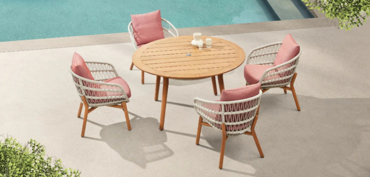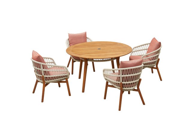 A Vasca Dining Set egy letisztult, stílusos és kényelmes kültéri étkezőgarnitúra, amely kiválóan alkalmas kisebb társaságok szabadtéri étkezéseire. A kerek teakfa asztallap természetes eleganciát sugároz, míg a négy fonott szék puha piros párnázattal biztosítja a komfortos ülést.