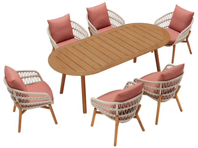 A Vasca szett a mediterrán stílus és a modern funkcionalitás tökéletes kombinációja. A kényelmes, fonott háttámlás és puha párnázott karosszékek kifinomult megjelenést biztosítanak, míg a fa hatású ovális étkezőasztal kiválóan alkalmas családi vagy baráti összejövetelekhez a szabadban.