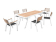 A York Dining Set kültéri étkezőgarnitúra elegáns megjelenésével, kiváló minőségű anyagaival és kényelmes kialakításával ideális választás teraszra vagy kertbe. A fehér porfestett alumínium váz és a kontrasztos fekete ülőfelületek modern, letisztult hatást keltenek. A 200 cm-es teljes teakfa asztallap természetes és időtálló felületet biztosít a szabadtéri étkezésekhez.