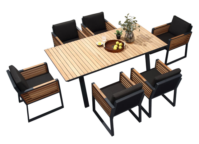 A New York Dining Set egy modern megjelenésű, prémium minőségű kültéri étkezőgarnitúra, amely a fa hatású asztallapot és az elegáns fekete alumínium vázas székeket ötvözi a maximális stílus és kényelem érdekében. Tökéletes választás mindennapi használatra vagy vendégek fogadására kertben, teraszon vagy verandán.
