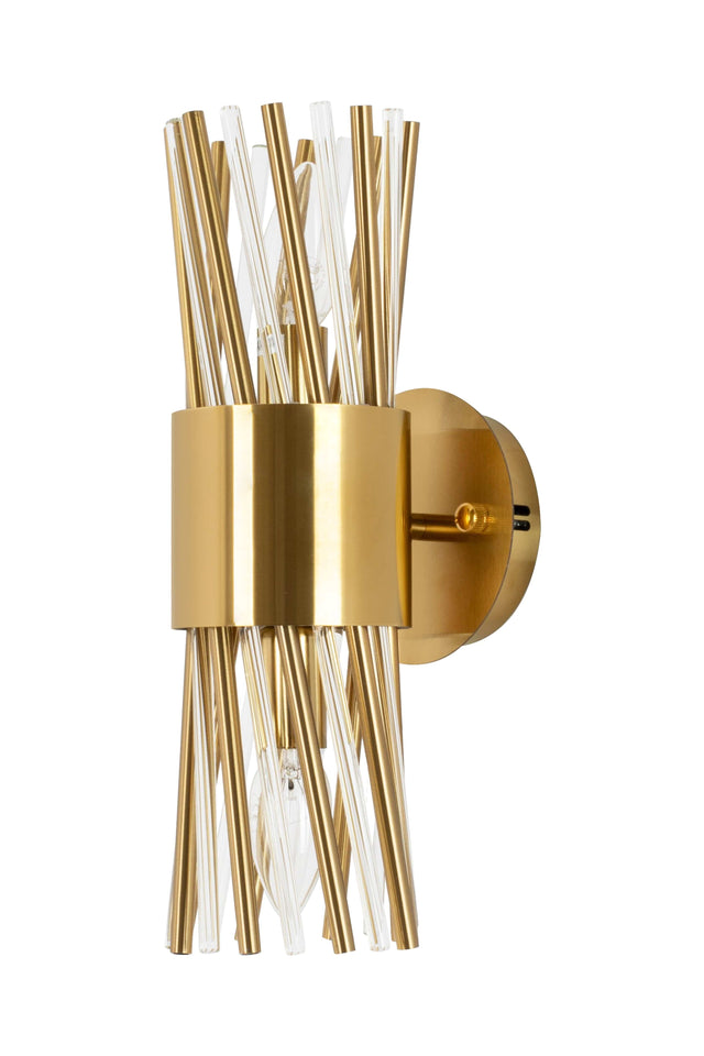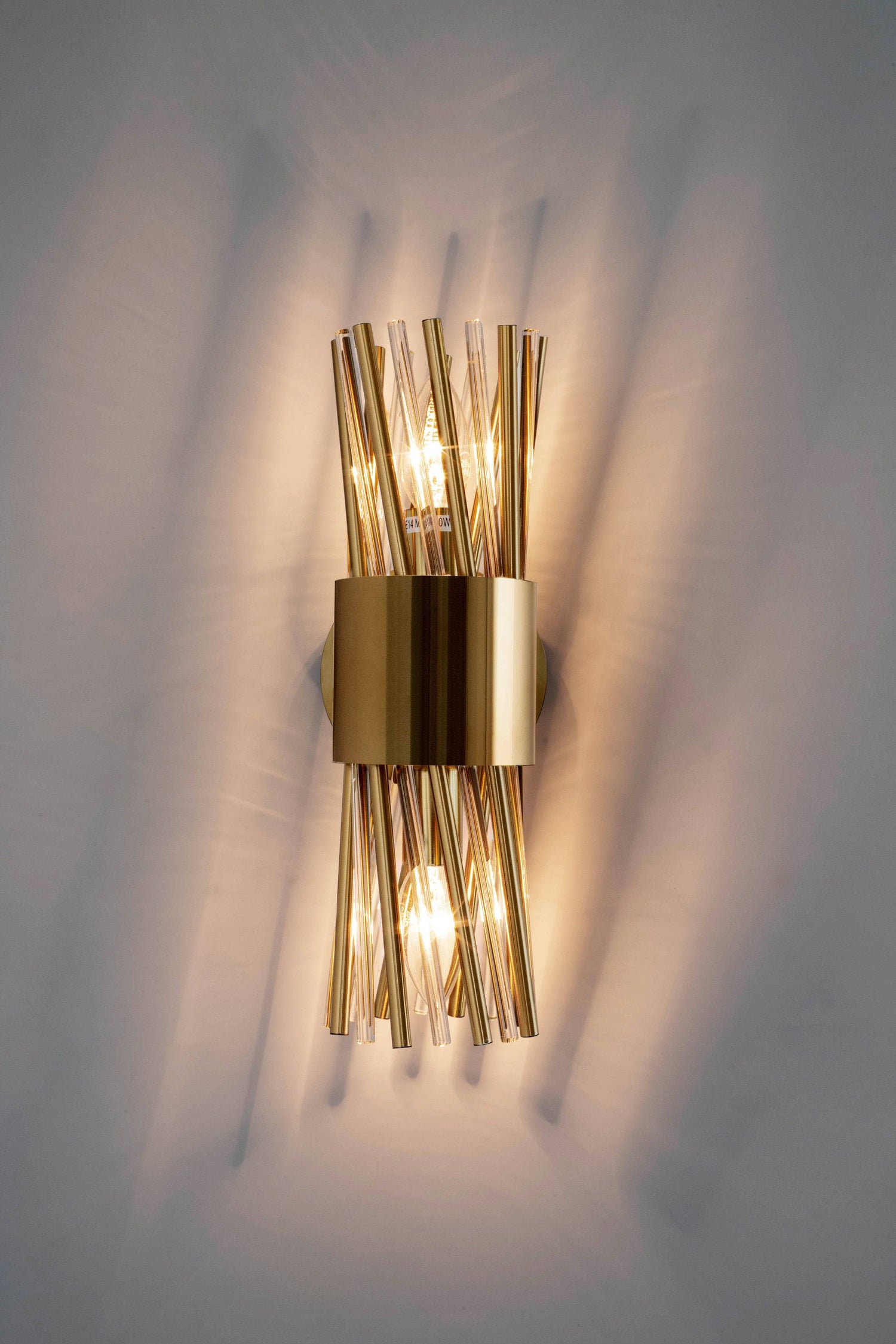 Fedezze fel a LORENZO arany fali lámpát, amely eleganciát és modern designot ötvöz. Az egész üvegből és rozsdamentes acélból készült lámpatest arany színe fényűző hatást kelt, míg az átlátszó lámpabúra és az arany elemek egyedi elrendezése különleges vizuális élményt nyújt.